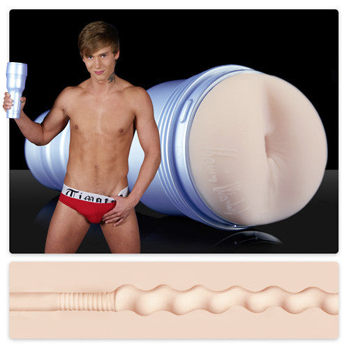 Skin-coloured anus masturbator based on gay star Kevin Warhol. Grooved and waved lust tunnel. Penetration depth approx. 25.5 cm, Ø 2 cm (flexible). The masturbator is removable from the pearly-blue coloured can. Material: TPR, ABS (case), phthalate-free according to EU Regulation REACH. Lubricant tester included.