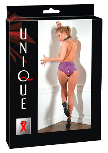 Purple coloured flat dipped latex panties with an open crotch. Material: 100% latex made from natural rubber latex which may cause allergies.