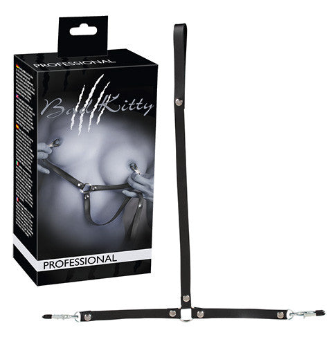 A leash (complete length approx. 62 cm) with a loop handle (approx. 7 cm long) has two straps (each 14 cm long) that both have crocodile clips on the end of them. The clips are adjustable and have removable rubber covers. Black/silver coloured. Material: split leather, metal (zinc-coated).