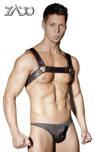 Chest harness made of black split leather and connecting metal rings. Adjustable for perfect fit. Material: split leather, metal.