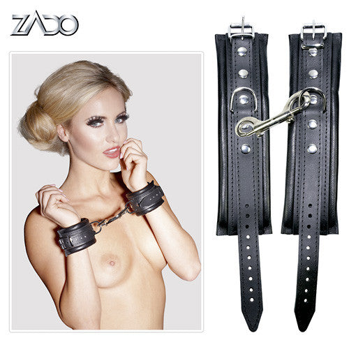 Softly padded handcuffs with a short strap perfect for delicate ankle joints. Fully made from black leather. Adjustable buckle closures. With double snap hook. Material: leather, split leather, metal.