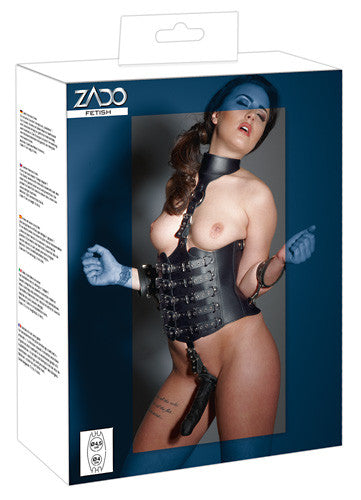 Wide waist cincher with lacing at the back. Jock strap that is attached with a buckle strap, which is one of the straps that leads to the collar. In addition there are handcuffs, which are attached by snap hooks and a latex dildo attached with press studs (approx. 17 cm long, Ø 4 cm). Material: split leather, metal, latex (made from natural rubber latex, which may cause allergies)