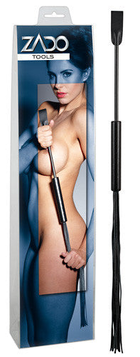 A whip with 40 cm long and soft leather tails on one end and a crop with a leather loop on a slightly flexible synthetic wand on the other. Middle part is made of wood. Black. Complete length 89 cm.