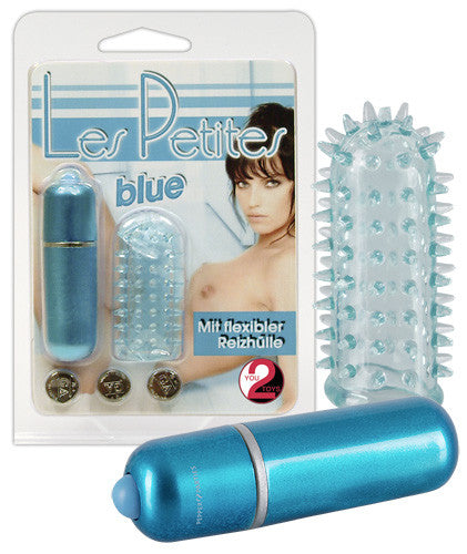 Purple mini vibrator plus a soft, purple/transparent sleeve with nubs. 3 levels of vibration. Total length 6 cm, Ø 1.8 cm. Material: ABS (vibrator), TPE (sleeve). Batteries included.
