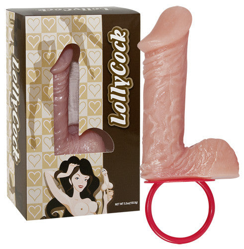 Pink cock-shaped strawberry flavoured toffee lollipop. Approx. size: 11.5 cm, 3 cm diameter.