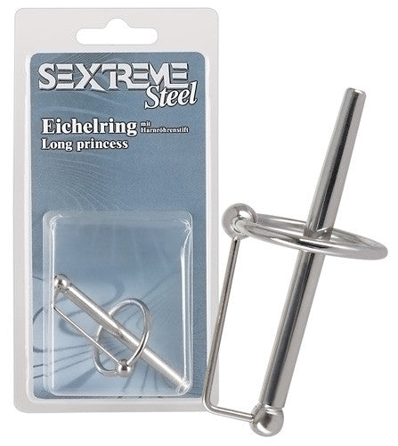 Glans ring with dilator! Put the pivotable ring around the glans and insert the end of the pin into the urethra. Total length approx. 8 cm, ring Ø 0.6 cm. Weight: 22 g. Material: polished, silver-coloured stainless steel.