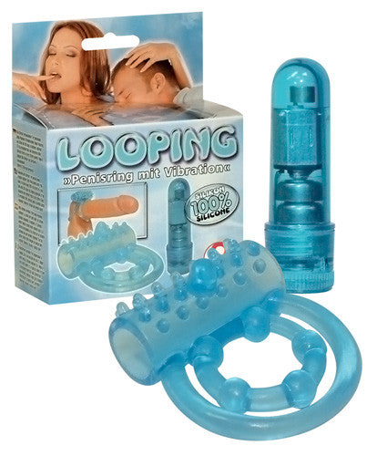 Tight-fitting double silicone-like penis ring (Ø approx. 2.5 cm, flexible) with removable mini vibrator (6 cm long, Ø approx. 1.5 cm). Colour: blue. Round cell batteries included.
