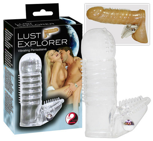 Transparent penis sleeve with stimulating nubs and ridges. Very flexible, soft material, Clit tickler with detachable mini vibrator.