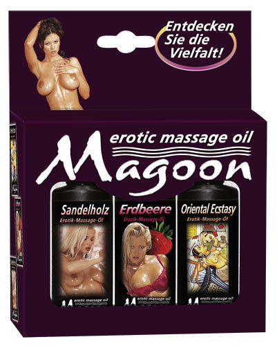 Three erotic massage oils in a set. High-quality, caring oils with arousing fragrances and long-lasting lubricant and gliding qualities. Washable. Made in Germany. Contents: each a 50 ml bottle: Magoon Sandal Wood, Magoon Strawberry and Magoon Oriental Ec