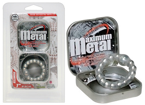 Cock ring with massaging, stimulating metal beads in the transparent silicone-like sleeve. Ø 3 cm (flexible). Comes inside a decorative metal box with a hinged lid.
