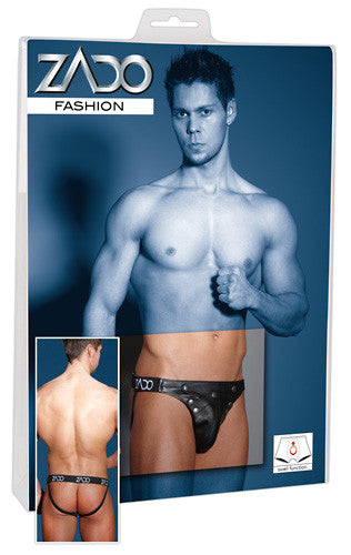 Jockstrap with a pouch, which has a swell function, that can be removed thanks to the press studs. Lamb nappa leather, wide fabric-covered elastic straps at the back that has the ZADO logo sewn onto it. Black with matte silver press studs. Material: 100% Lamb nappa leather, inner lining: 100% cotton.