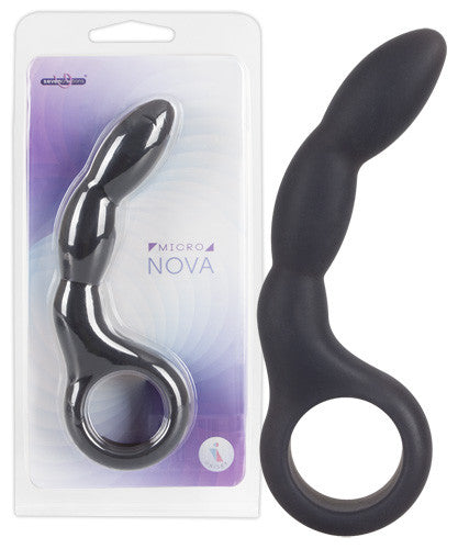 Black anal strand with retraction loop. The shaft is slightly bent with merging bulges. Bendable. Total length approx. 14 cm, Ø 1.3-2 cm. Material: silicone, phthalate-free according to EU Regulation REACH.