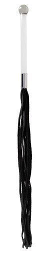 Black mini whip with slender split leather straps and a handle made of acrylic glass (transparent/silver). Total length approx. 38 cm.
