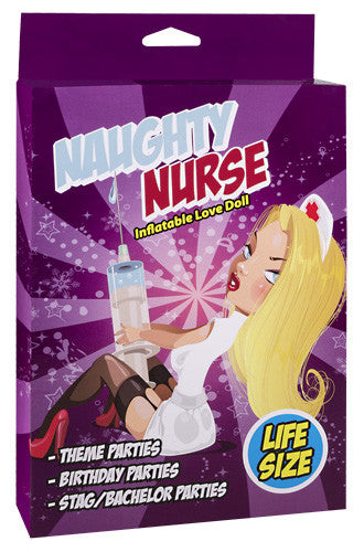 Naked love doll with imprinted face and hair, nurse bonnet and stethoscope. With three lust holes (oral, vaginal, anal). Inflatable up to life size. Material: PVC, phthalate-free according to EU Regulation REACH.