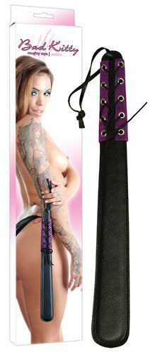 Black/purple multi-layered paddle. One side softly padded. Sewd edging. The handle is wrapped into suede and with lacing. 42 x 5 cm (on the widest point).