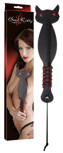 Black cat-shaped paddle. With seams, rhinestone eyes and red laced velour cuff at the handle. Total length approx. 38 cm. Material: polyurethane, split leather.