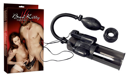 Smoke grey penis pump with a measuring scale up to 20 cm. With three cuffs of different size (Ø 2.3, 2.7 and 3.1 cm). All cuffs elastic. Total length of the cylinder: 23 cm, Ø 5.5 cm. Hose with pump ball, outlet valve, vibro bullet with remote control and multi-speed vibration. Material: TPE, ABS, rubber, PVC and latex. Free of phthalates according to EU regulation REACH. Please order batteries separately: 2 x AA.