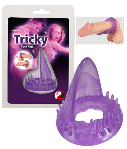Purple coloured penis ring with knobs for clitoris stimulation and a small shaft that thickens the penis a bit and also supports it. Complete length approx. 7 cm, Ø 2.5 cm (flexible). Material: TPR, phthalate-free according to EU Regulation REACH.