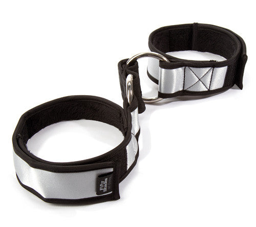 Black/silver-coloured handcuffs, size is adjustable using the Velcro fasteners. Material: polyester, polypropylene, metal. Includes an eye mask and door hanger.