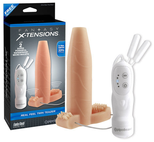 Skin coloured penis sleeve to lengthen and thicken - for up to 33% more width! Straight form with slight veining, open at the top. Includes 2 micro bullets with 5 vibration modes which are placed in the knobbed plaids for stimulation of the clitoris and testicles. Approx. 15 cm long, inner-Ø 3 cm. Material: TPR, phthalate-free according to EU Regulation REACH. Includes lubricant and cleaner.