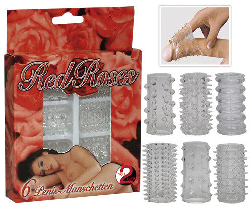 6 transparent jelly penis sleeves with different stimuli structures. Size: 4.5 cm, Ø flexible. 6 piece-set.