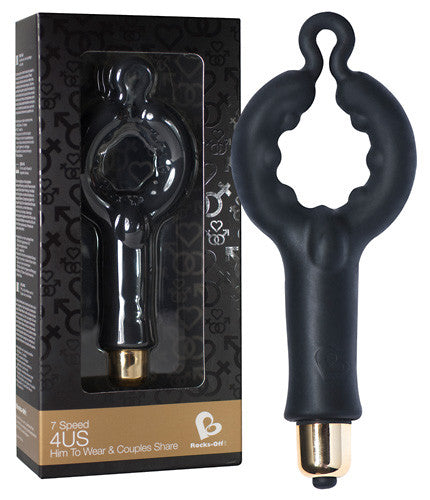 Black cock ring vibrator with seven vibration functions. Complete length approx. 14 cm, opening for the penis 2.6 to 4.6 cm (flexible). Material: silicone, ABS, phthalate-free according to EU Regulation REACH. Includes battery.