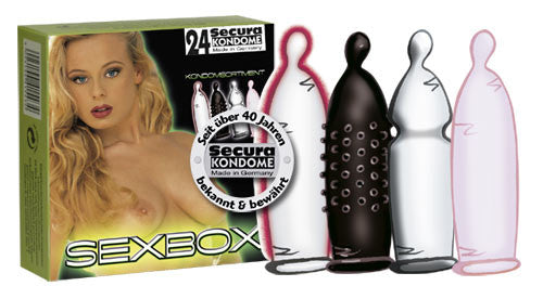 24 premium Secura condoms in 4 varieties: "Long-time Lover" - with delay cream for prolonged sexual pleasures! "Dark Desire" - black with tickling dots. "Potency" - tight fitting pleasures. "Gold" - the classic cut condom.