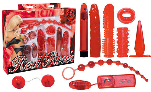 9-piece lust set made of red-transparent gliding material. Vibrator (length 17.5 cm, Ø 2-2.5 cm) and a great range of various sex toys. Continuously variable. Mignon batteries included.