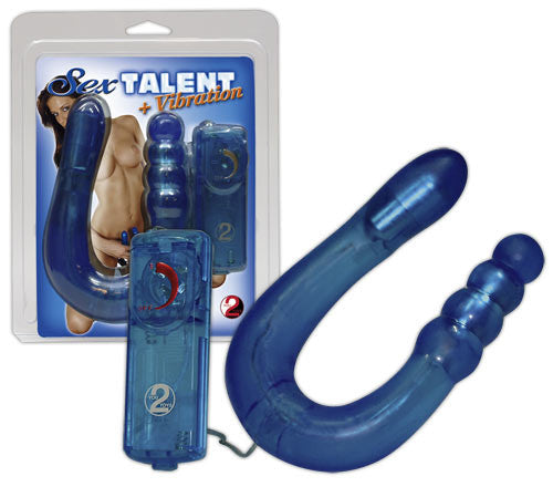 Blue double vibrator, U-shaped. Total length 32 cm, Ø 2-3 cm. Multi-speed vibration, controllable with the easy-to-handle stimulation control. Material: TPE, ABS, free of phthalates according to EU regulation REACH.
