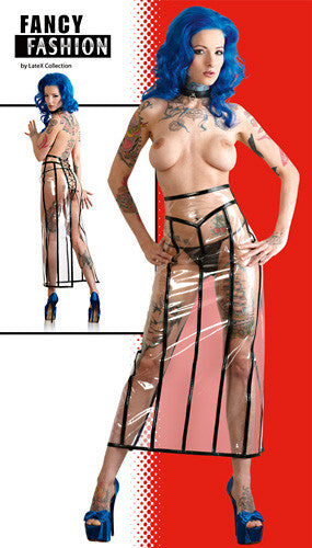 Long, narrow and transparent skirt. Waist-high cut with a slit and lacing at the back. Contrasting stripes made of black imitation leather. Material: polyurethane.